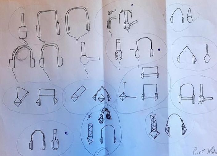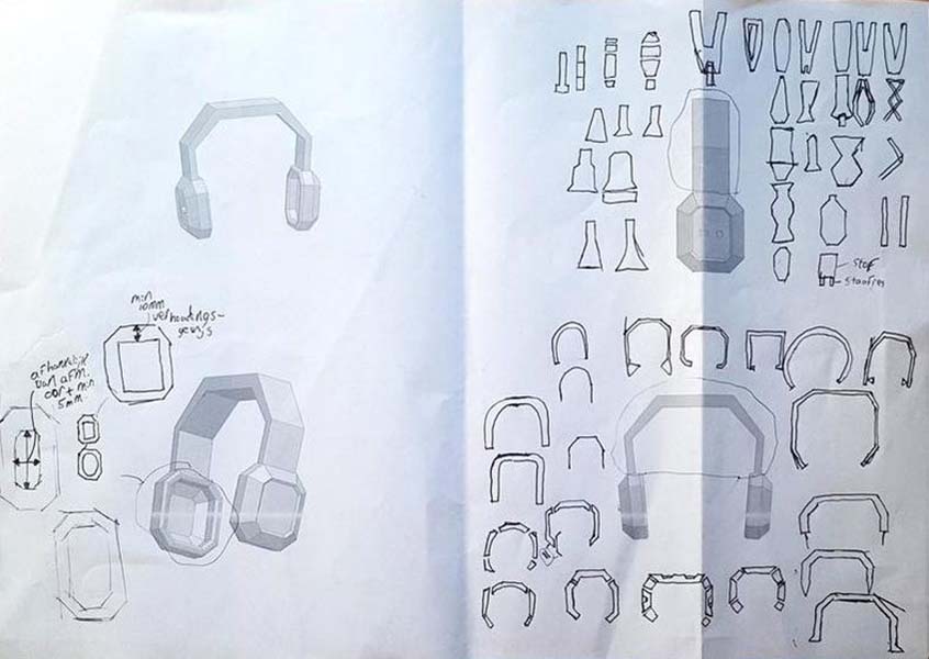 De 2e afbeelding is een CAD model van een gekozen ontwerp, de bedoeling was om vanuit dit model meerdere vormen te gaan schetsen op papier. De 3e afbeelding geeft dit weer, waar ook gelijk verder wordt gekeken naar meerdere vormen en manieren van de hoofdband.