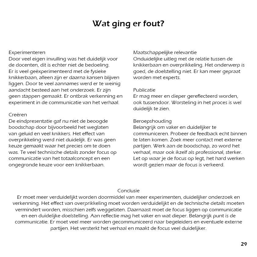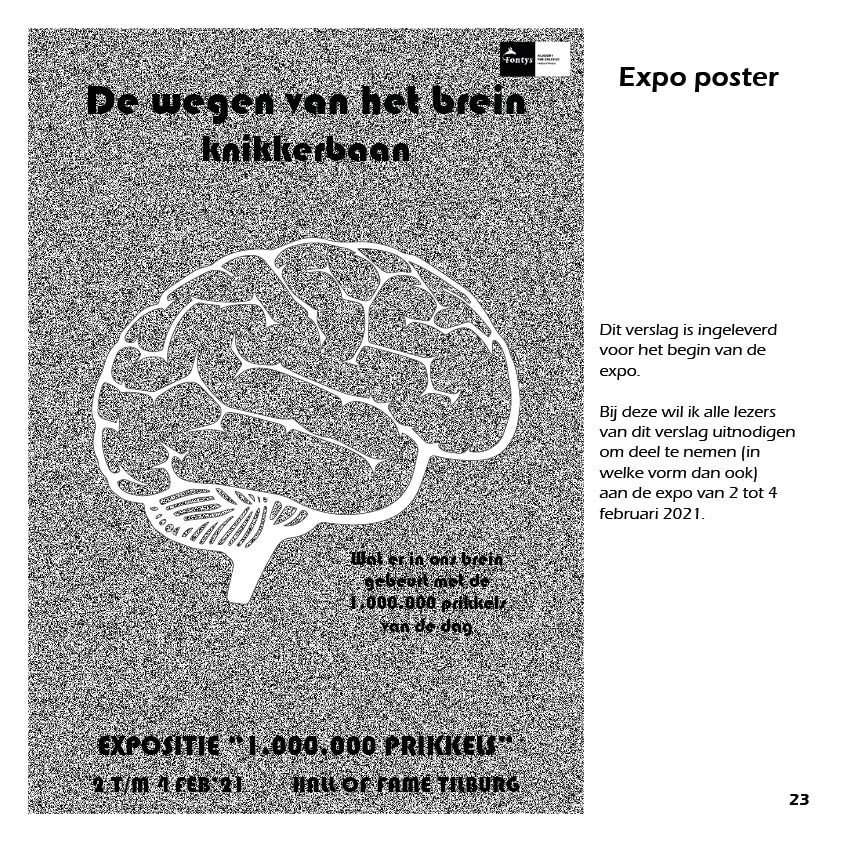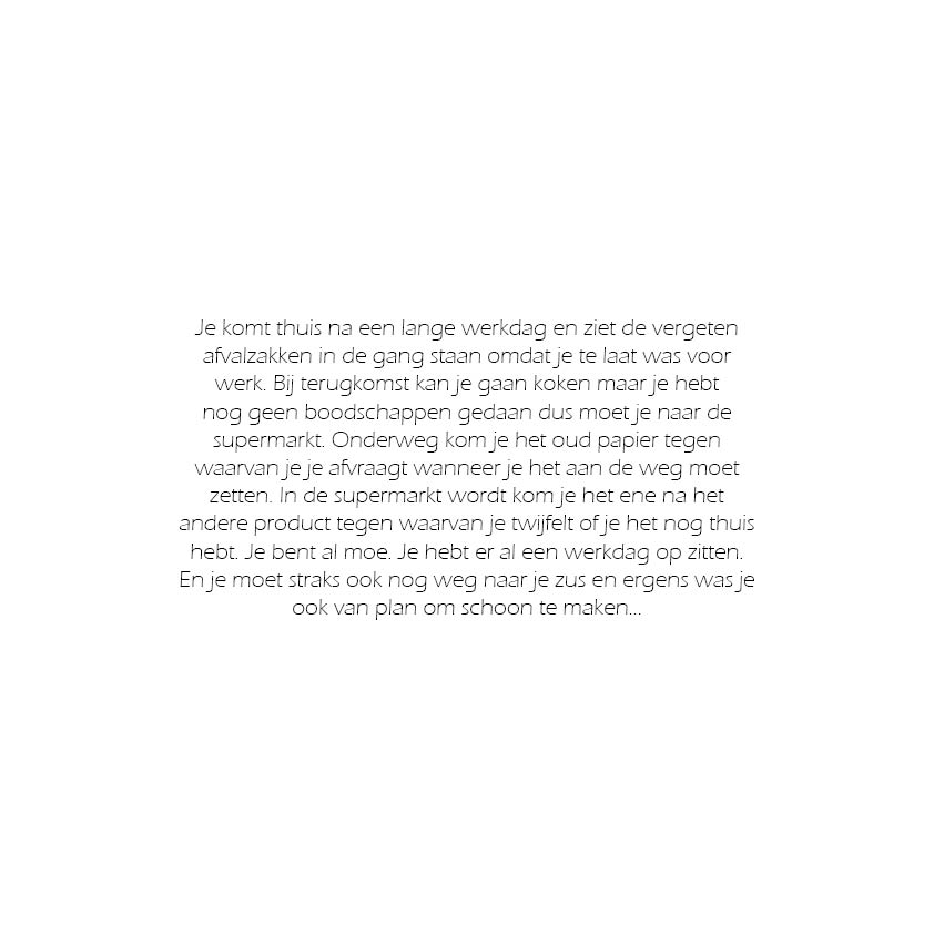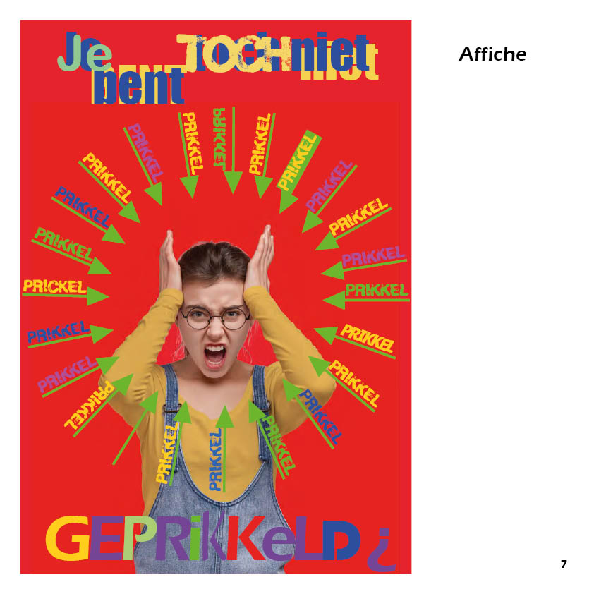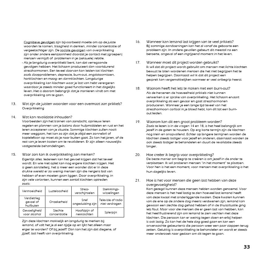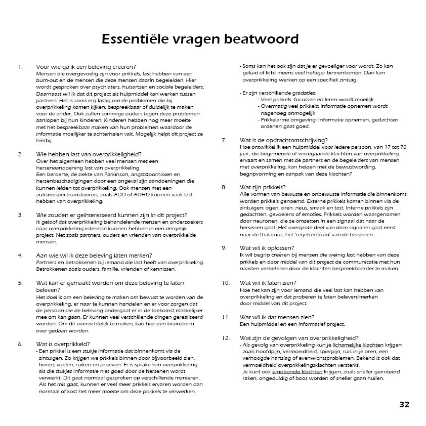 Dagelijks krijg je honderden, misschien wel duizenden prikkels binnen. Een prikkel is een stukje informatie die je bewust of onbewust binnenkrijgt. Dit gebeurt extern door je zintuigen maar kan ook intern gebeuren door je emoties of gedachten. Voor sommige mensen kan de stroom aan prikkels te veel worden. Mensen die hier snel last van kunnen hebben zijn onder andere mensen met een hersenaandoening of een vorm van ADD, maar steeds meer mensen buiten deze groepen hebben last van overprikkeling. Deze ontwikkeling is vooral terug te vinden in de toenemende burn-out cijfers. Ik wil met dit project bewustwording creëren om overprikkeling beter te leren en helpen te begrijpen door te helpen bij het gesprek, een gesprek kan aanwakkeren en voor begrip kan zorgen bij de naasten.